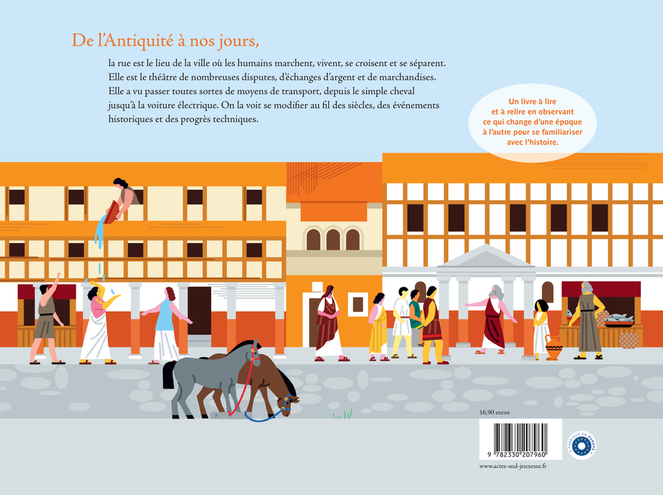 De l’Antiquité à nos jours, la rue est le lieu de la ville où les humains marchent, vivent, se croisent et se séparent. Elle est le théâtre de nombreuses disputes, d’échanges d’argent et de marchandises. Elle a vu passer toutes sortes de moyens de transport, depuis le simple cheval jusqu’à la voiture électrique. On la voit se modifier au fil des siècles, des événements historiques et des progrès techniques.