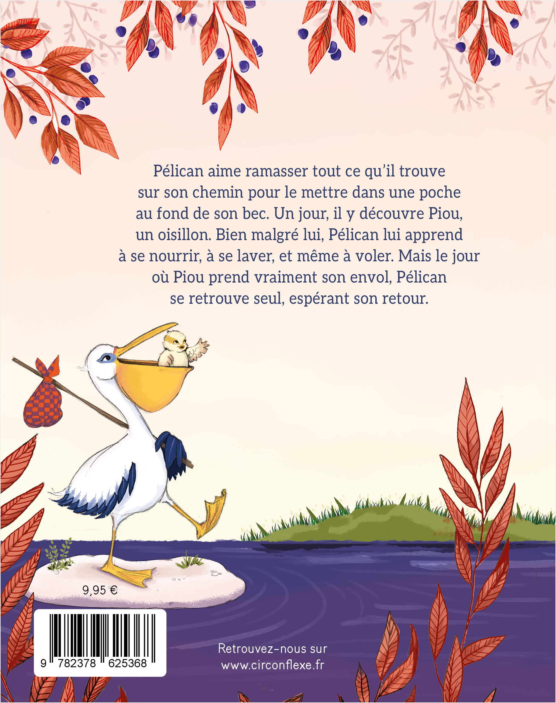 Pélican aime ramasser tout ce qu’il trouve sur son chemin : clé à molette, fourchette, paire de lunettes… pour le mettre dans une poche au fond de son bec. Un jour, il y découvre Piou, un oisillon. Bien malgré lui, Pélican lui apprend à se nourrir, à se laver, et même à voler. Mais le jour où Piou prend vraiment son envol, Pélican se retrouve seul, espérant son retour.