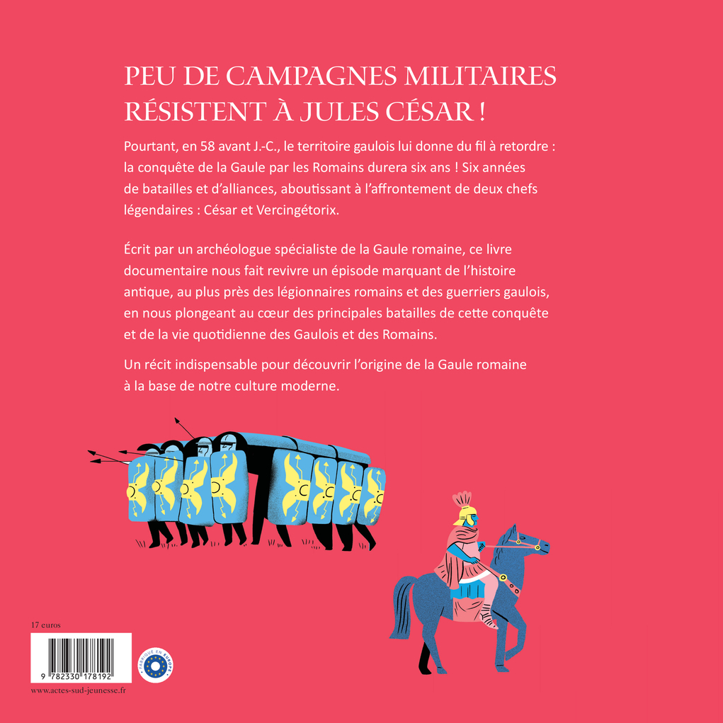 Dans ce livre, on découvre d’abord la Gaule d’avant la conquête romaine. Ce territoire à l’agriculture florissante et riche en matières premières est particulièrement attractif, et Jules César, à la faveur d’un conflit avec les Hélvètes, décide de l’envahir, aidé par sa puissante armée de légionnaires. L’auteur évoque la vie quotidienne des soldats, mais aussi celle des cavaliers gaulois, et nous fait vivre cette guerre de l’intérieur, bataille après bataille. Malgré des révoltes et une forte résistance de l’armée gauloise menée à partir de 52 avant J.-C. par le chef Vercingétorix, la conquête s’achève par le siège d’Alésia et la victoire de l’envahisseur.