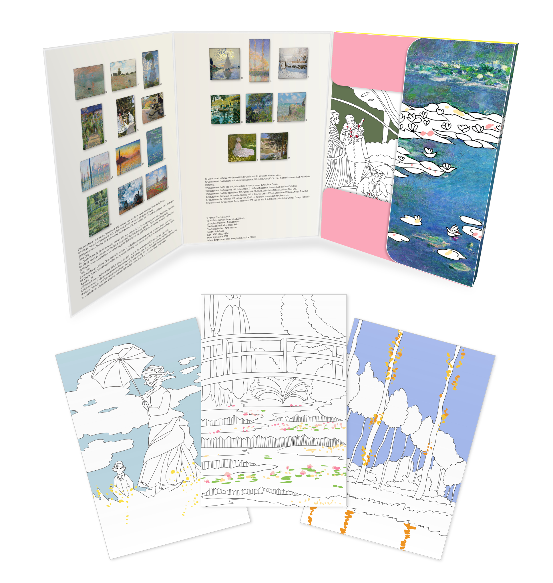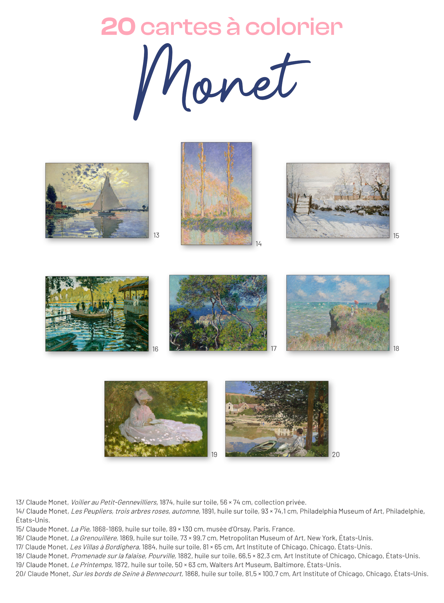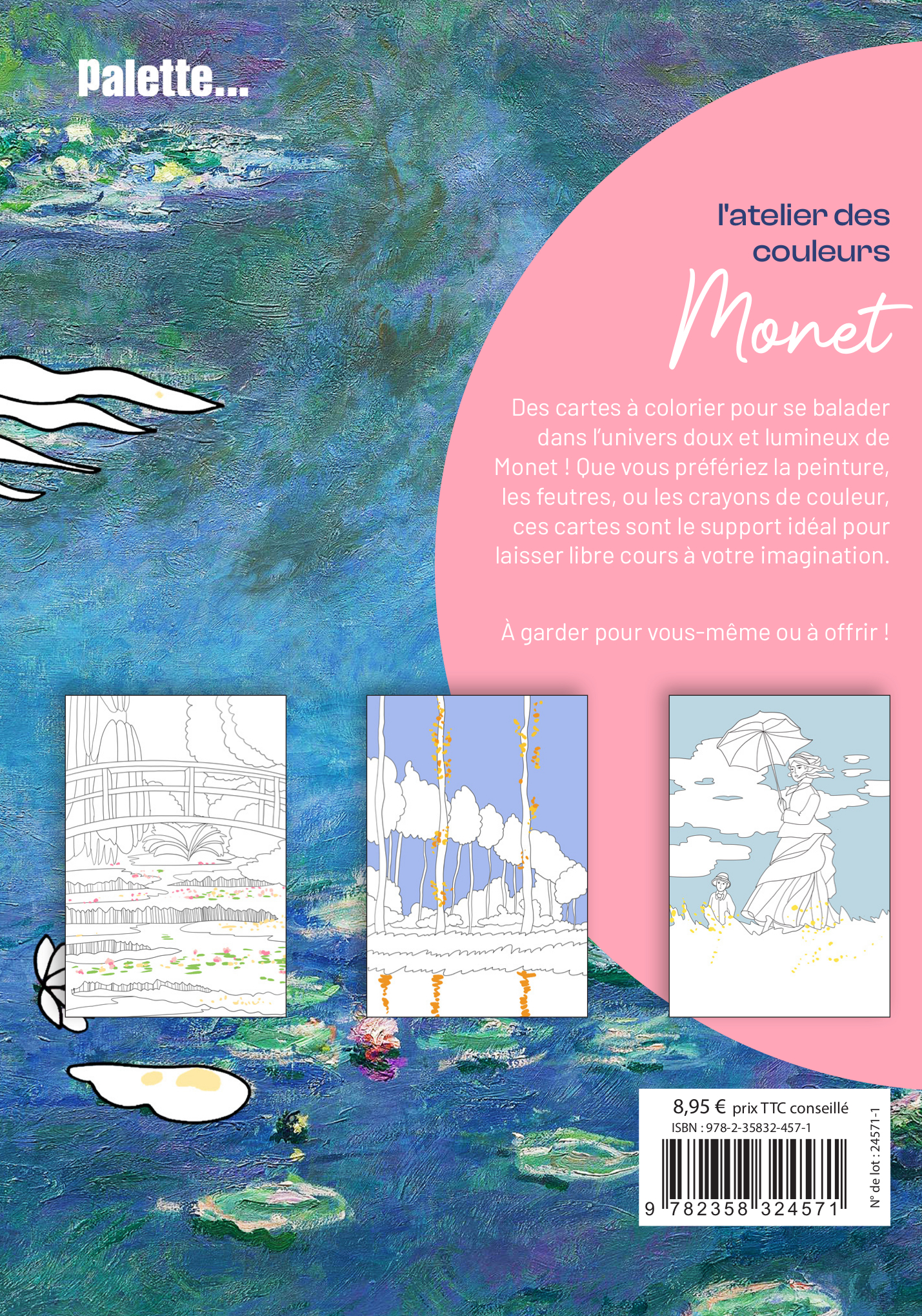 20 cartes à colorier, tirées des plus belles oeuvres de Claude Monet, pour apporter de la couleur et de la douceur à son quotidien ou à celui de ses amis et de sa famille !