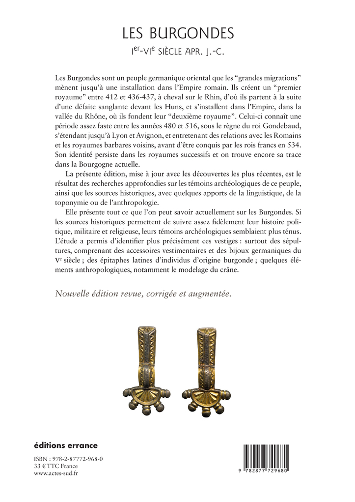 Peuple germanique originaire de l’actuelle Pologne, fixé sur le Rhin puis en Gaule Rhodanienne, les Burgondes ont inscrit leur nom dans la géographie de l’Europe où figure toujours une ‘Bourgogne’ héritière de plusieurs royaumes, et dans ses grandes épopées comme celle des Nibelungen. Ils ont compté parmi les principaux acteurs de la période des Grandes Invasions en Occident. Ce livre fait le point des connaissances actuelles sur ce peuple.