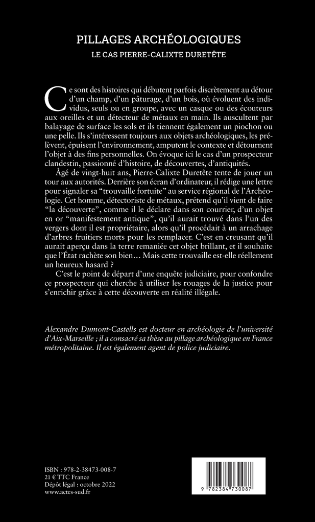 Âgé de vingt-huit ans, Pierre-Calixte Duretête tente de jouer un tour aux autorités. Derrière son écran d’ordinateur, il rédige une lettre pour signaler sa ‘trouvaille fortuite’ au service régional de l’Archéologie. Cet homme, détectoriste de métaux, prétend qu’il vient de faire ‘la découverte’, comme il le déclare dans son courrier, d’un objet en or ‘manifestement antique’, qu’il aurait trouvé dans l’un des vergers dont il est propriétaire, alors qu’il procédait à un arrachage d’arbres fruitiers morts pour les remplacer. C’est en creusant qu’il aurait aperçu dans la terre remaniée cet objet brillant, et il souhaite que l’État rachète son bien… Mais cette trouvaille est-elle réellement un heureux hasard??